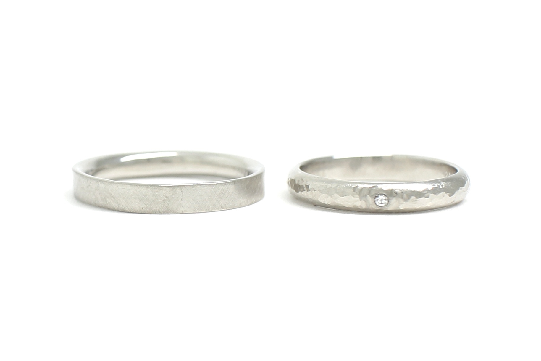 右:プラチナ950/まる3.0mm/ハンマー仕上げ/表面ダイヤ1.50mm×1石 ¥105,930- -