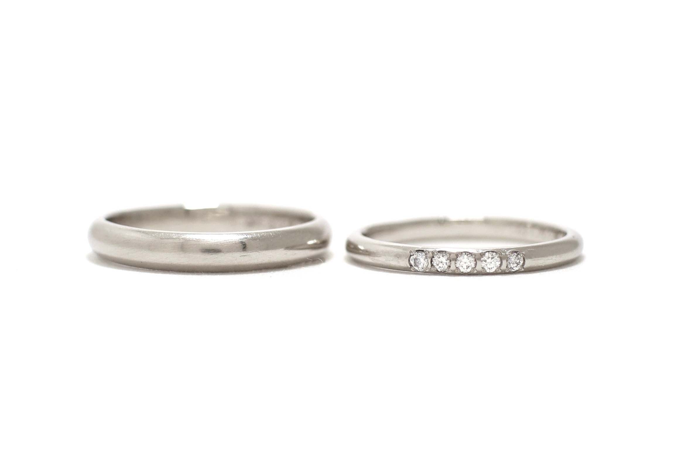 右:プラチナ950/まる2.0mm/ナチュラル仕上げ/表面ダイヤ1.50mm×5石(4点留め) ¥111,650- -